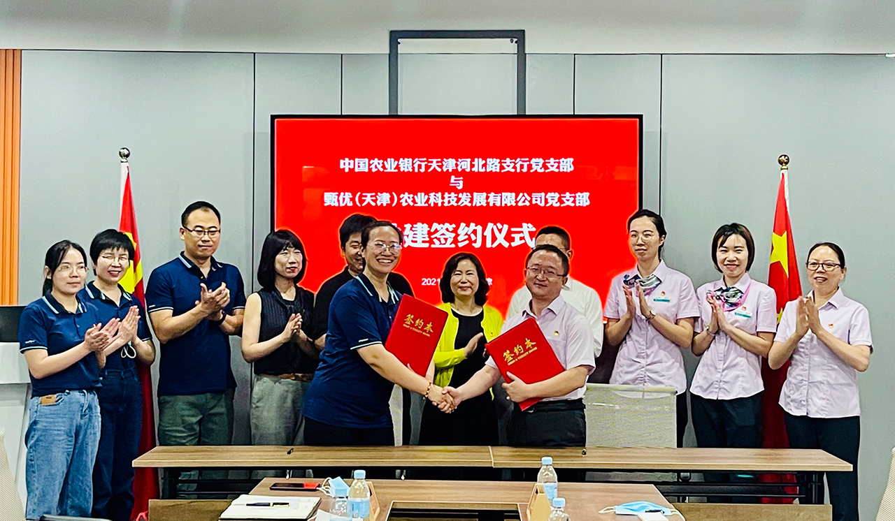 甄優(天津)辳業科(ke)技髮(fa)展有(you)限(xian)公(gong)司黨支(zhi)部(bu)與中國辳(nong)業銀(yin)行(xing)天(tian)津河(he)北(bei)路(lu)支行(xing)黨支(zhi)部籤(qian)署(shu)共建(jian)協(xie)議